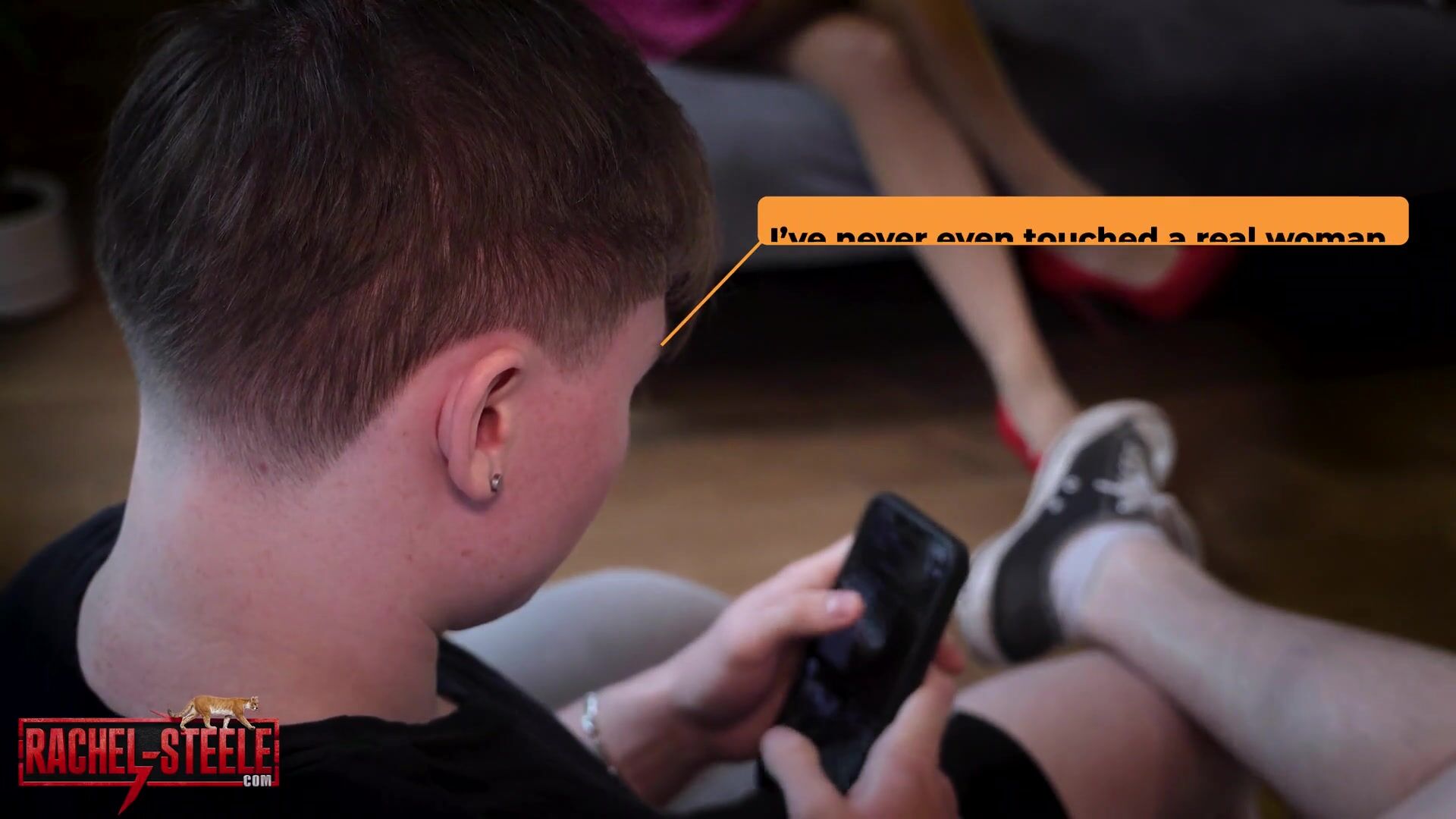 two beautiful girls are sitting in the living room of a house talking and have in front of a guy watching the movil and then one is with sexy lingerie and the other in sportswear and they are in the kitchen with the boy and then they show the two wearing sexy lingerie in the room where the boy is and they make a threesome