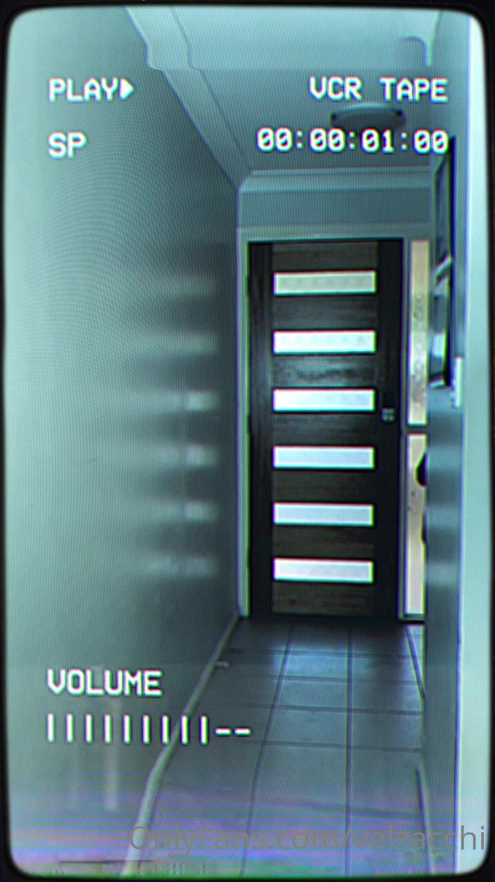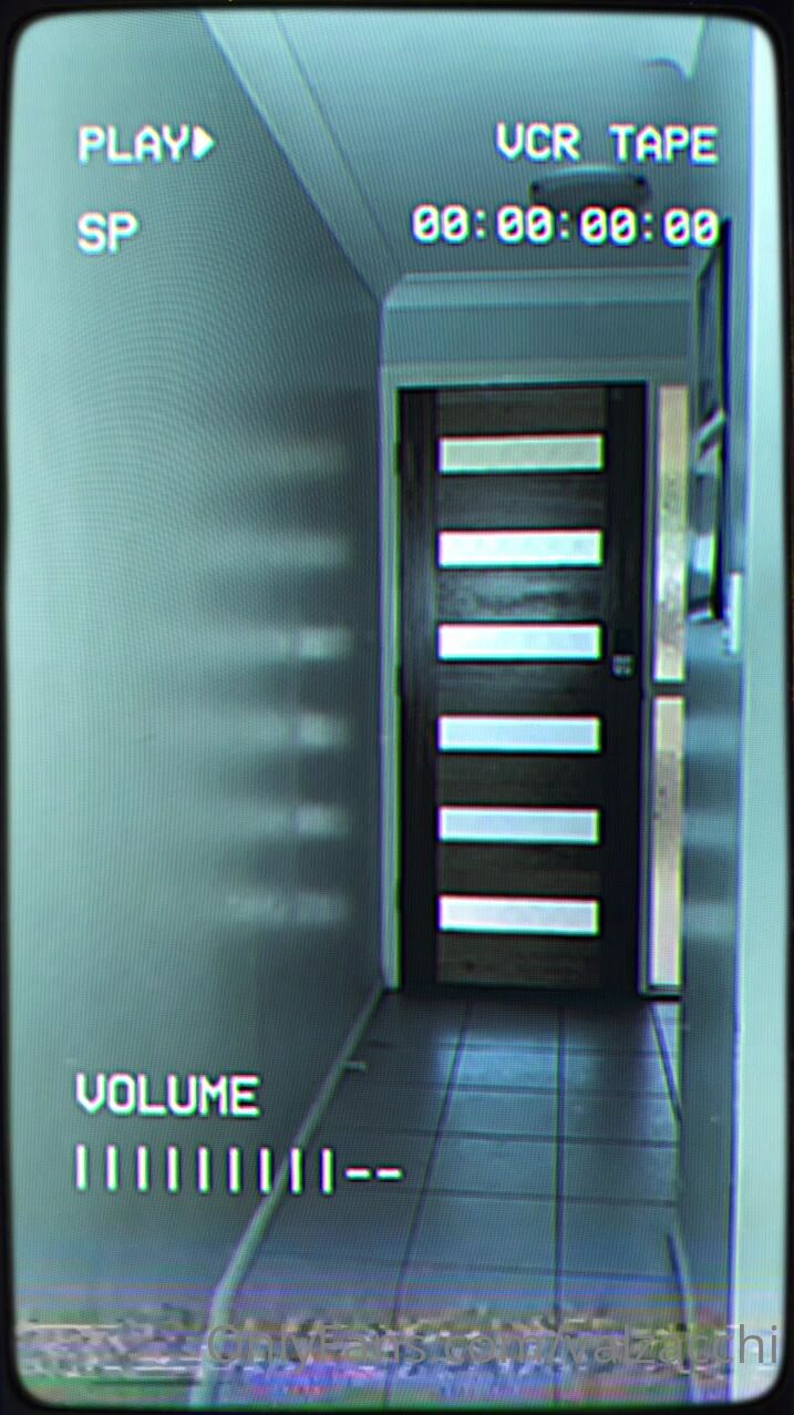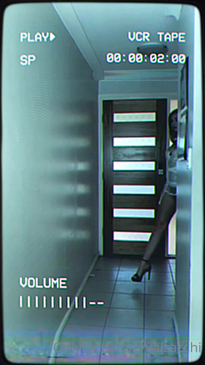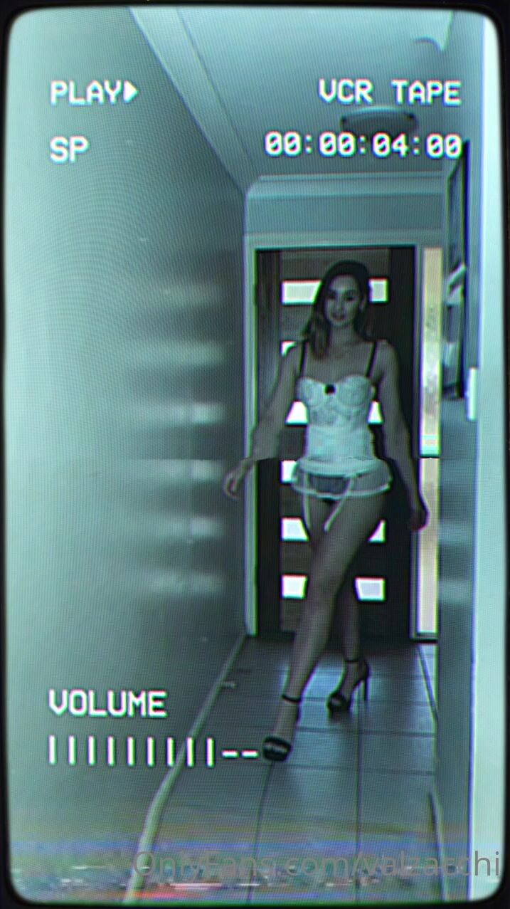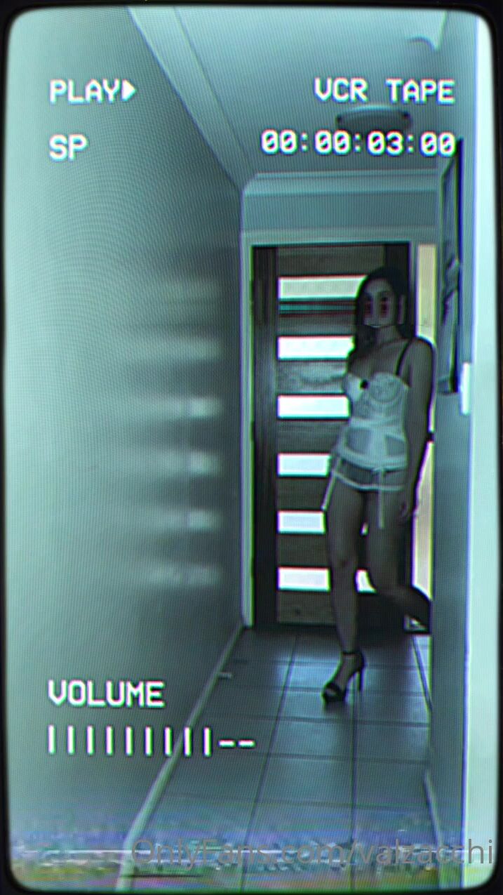 Cass walks down her hall wearing sexy black bra and panties with a white corset over top and black heels.